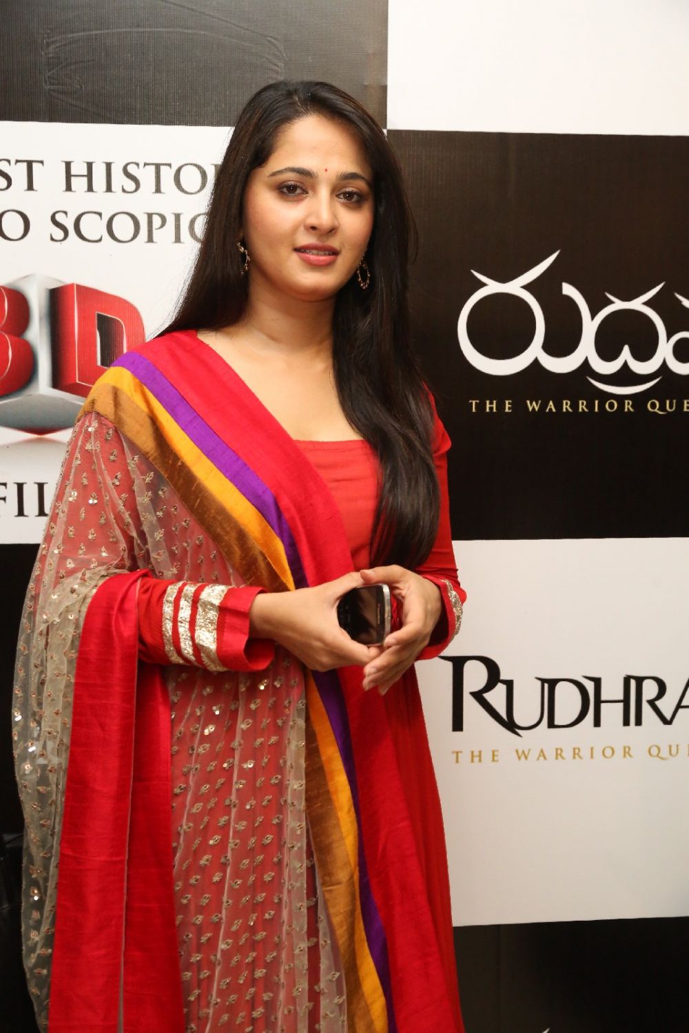 Anushka looks beautiful in Red at Rudramadevi teaser launch