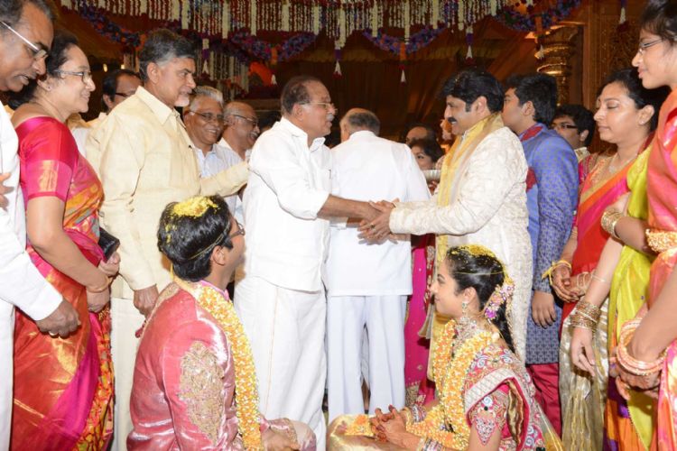 Actor Nandamuri Balakrishna�s younger daughter Tejaswini ties the knot with Sri Bharat at a grand ceremony held in HiTex Convention Center in Hyderabad on Wednesday. Several top political leaders and celebrities of Telugu and Tamil film industry attended the event and blessed the newlywed couple.
