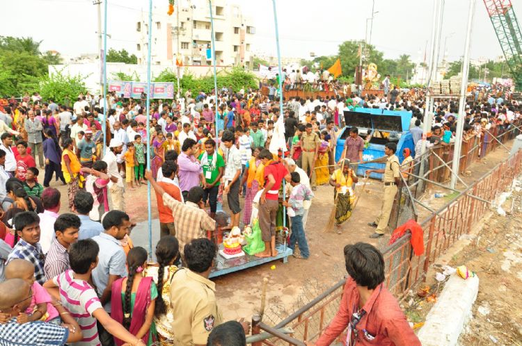 A massive Ganesh idol leading the procession of Ganesh Nimajjanam which began from Charminar to Husain Sager on Wednesday.