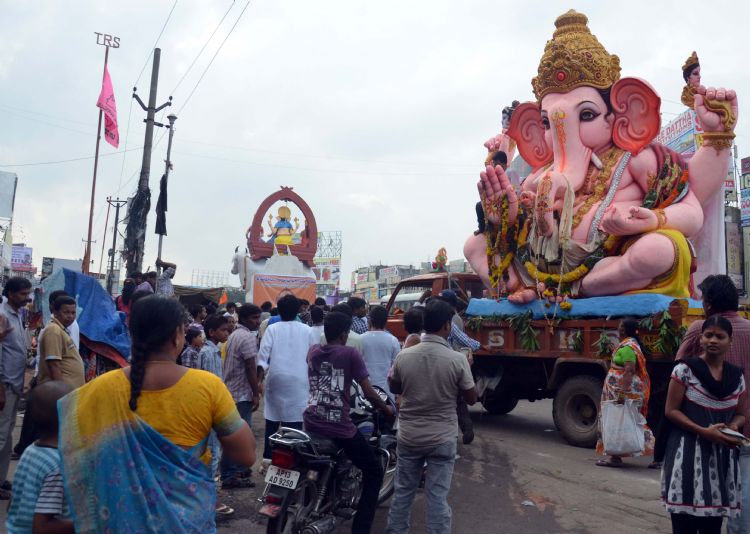 A massive Ganesh idol leading the procession of Ganesh Nimajjanam which began from Charminar to Husain Sager on Wednesday.