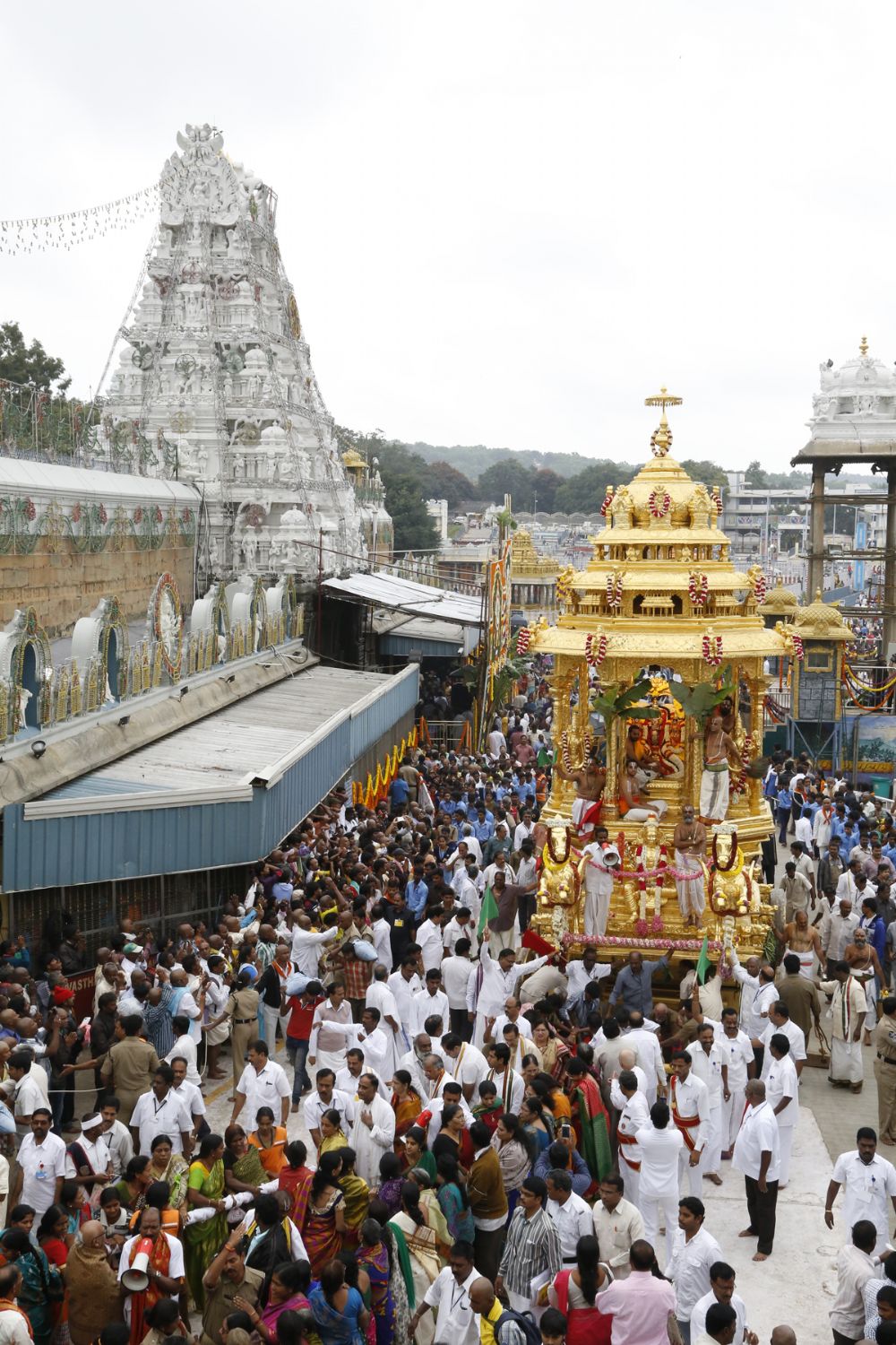 Processional deity of Lord Malayappaswamy along with his consorts were taken out in procession atop Golden Chariot around four mada streets in connection with Vaikunta Ekadasi at Tirumala on Thursday.