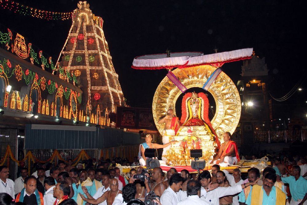 The annual festival of Surya Jayanthi has been observed with religious fervour in Tirumala on Monday. Lord malayappa swamy in the guise of Lord surya narayanamurthi decked on a colourfully decorated golden surya prabhakara vahanam took celestial ride along four mada streets.