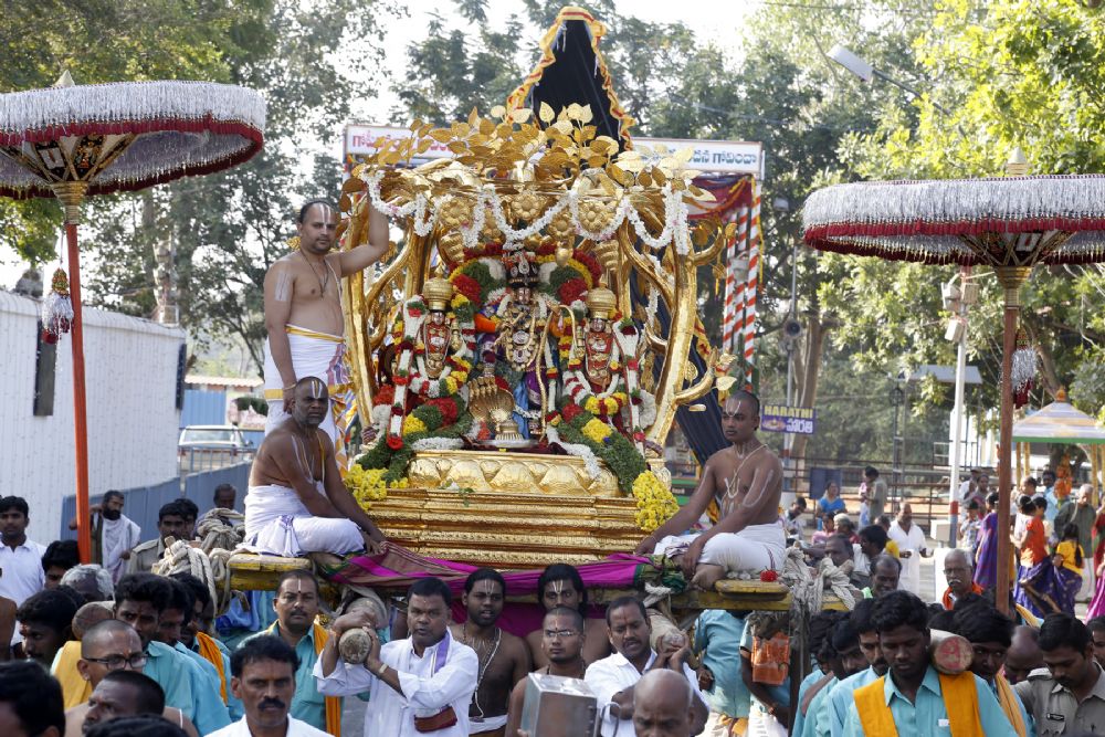 On the fourth day of Kalyana Venkateswara Swamy Temple Brahmotsavam in Tirupati, Lord Venkateswara along with his consorts being the boon giver takes ride on Kalpa Vruksha to bless his devotees.