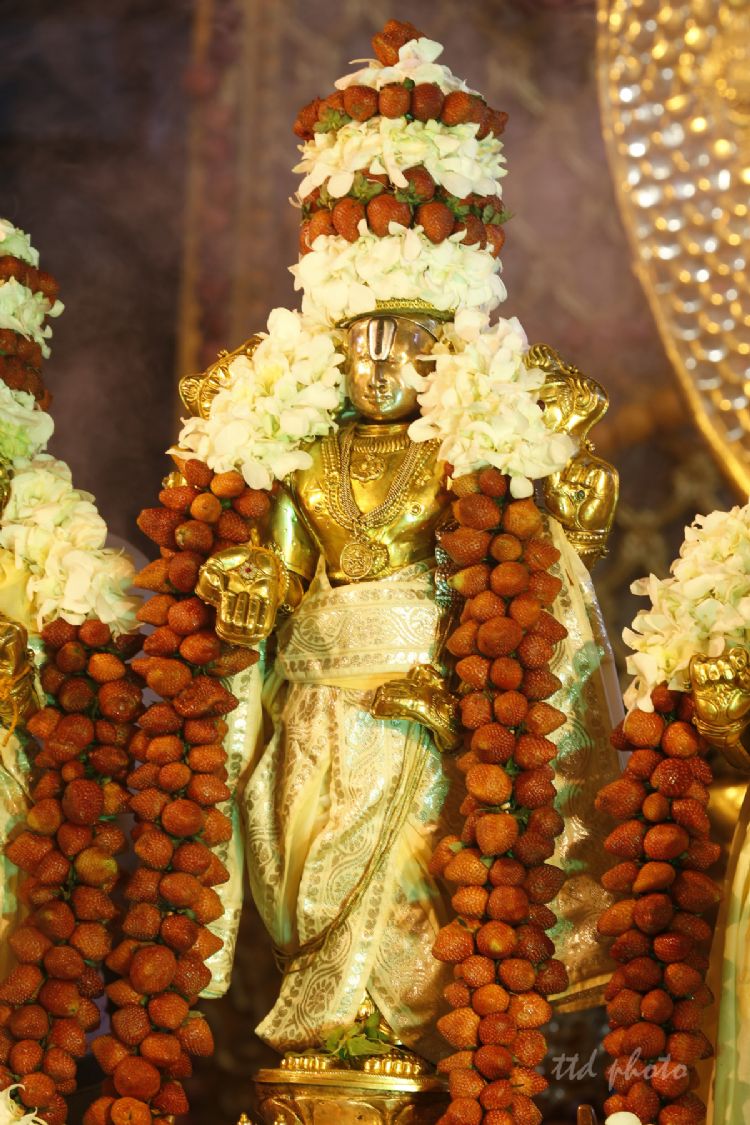 Fruit Decoration was the surprise display at the Snapana Thirumanjanam ritual at the Swamivari temple at Tirumala as part of the ongoing Brahmotsavam-2014. Not just garlands, a massive green canopy made out of grapes, apple, sweet lemon, apple, banana and pineapple etc spread over 5x10 umbrealla space over the utsava deities of Sridevi, Malayappaswami and Bhoodevi enthralled the devotees and pilgrims. The fruit decorations were showcased at the Thirumanjanam during the 2, 3rd and 4th day of the Brahmotsavam.