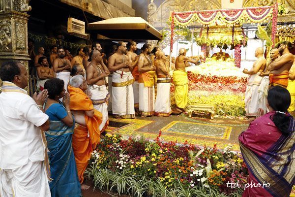 Enchanting fragrance spread all over the premises of Sampangi Prakaram, where the festival of flowers-Pushpayagam took place in ceremonial way in Tirumala on Friday. Traditional flowers including sampangi, maruvam, davanam, chamanthi, roses, kaluva etc. were blessed to have touched the deities amidst chanting of vedic hymns.