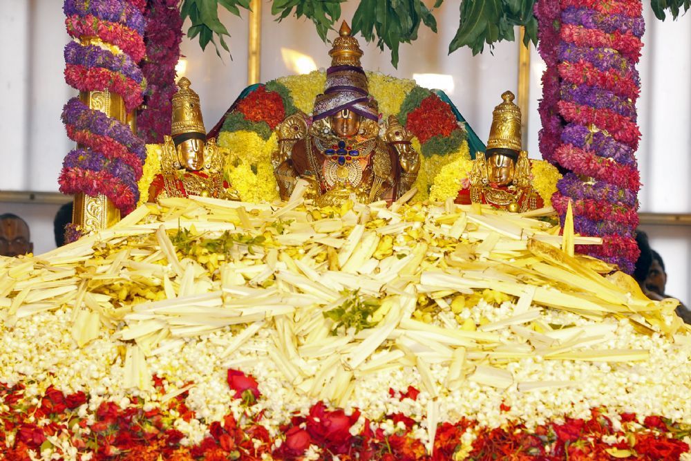 Enchanting fragrance spread all over the premises of Sampangi Prakaram, where the festival of flowers-Pushpayagam took place in ceremonial way in Tirumala on Friday. Traditional flowers including sampangi, maruvam, davanam, chamanthi, roses, kaluva etc. were blessed to have touched the deities amidst chanting of vedic hymns.