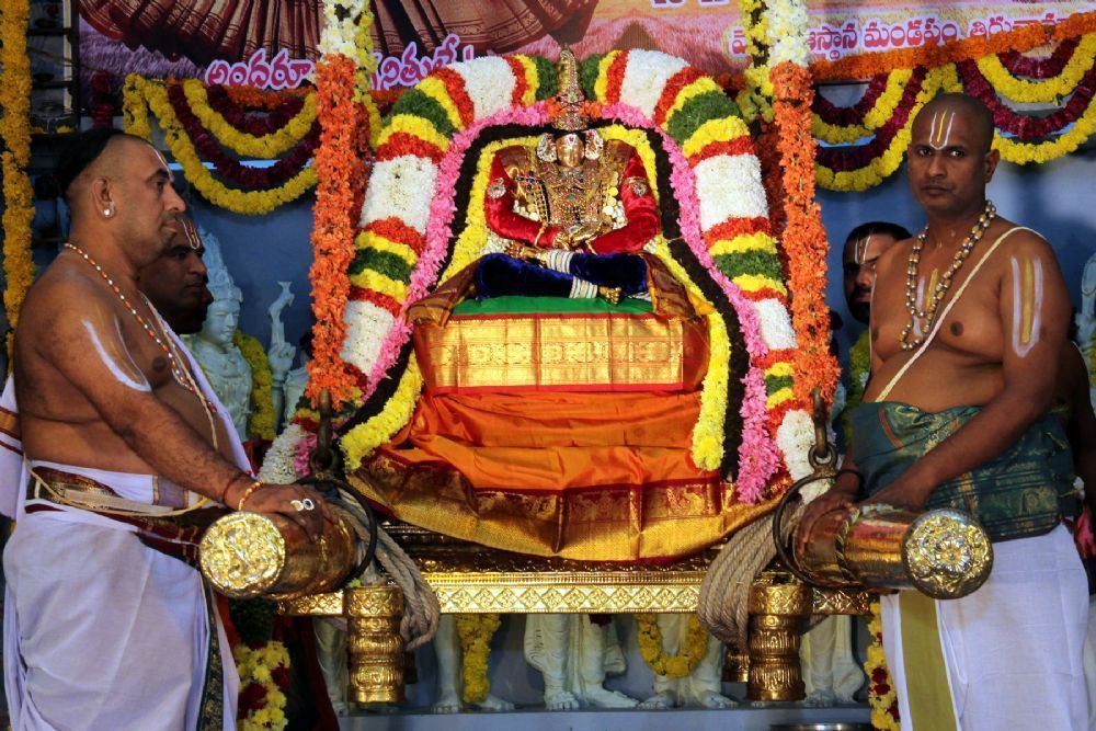 On the third day of the annual Karthika Brahmotsavams, the processional deity of goddess Padmavathi Devi, in the guise of “Kaliya Mardhani” was taken around the four-mada streets of Tiruchanur temple. On the first day the goddess has taken a celestial ride on Chinna Sesha Vahanam and on the second day goddess blessed the devotees on Pedda Sesha Vahanam.