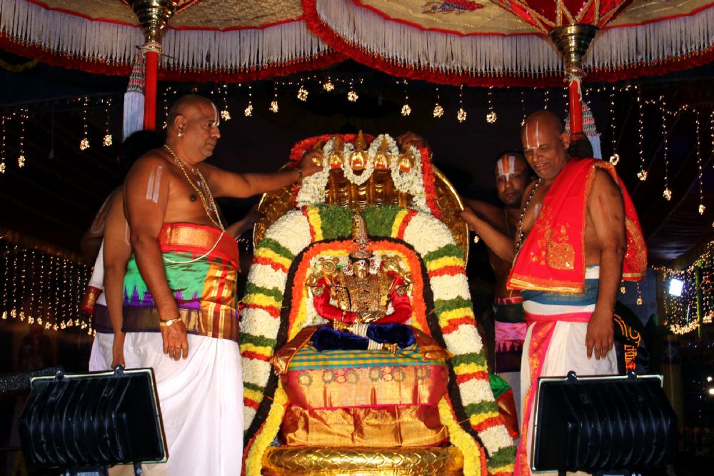 On the third day of the annual Karthika Brahmotsavams, the processional deity of goddess Padmavathi Devi, in the guise of “Kaliya Mardhani” was taken around the four-mada streets of Tiruchanur temple. On the first day the goddess has taken a celestial ride on Chinna Sesha Vahanam and on the second day goddess blessed the devotees on Pedda Sesha Vahanam.