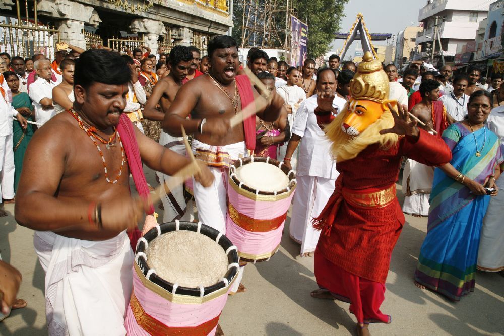 On the third day of the annual Karthika Brahmotsavams, the processional deity of goddess Padmavathi Devi, in the guise of “Kaliya Mardhani” was taken around the four-mada streets of Tiruchanur temple. On the first day the goddess has taken a celestial ride on Chinna Sesha Vahanam and on the second day goddess blessed the devotees on Pedda Sesha Vahanam.