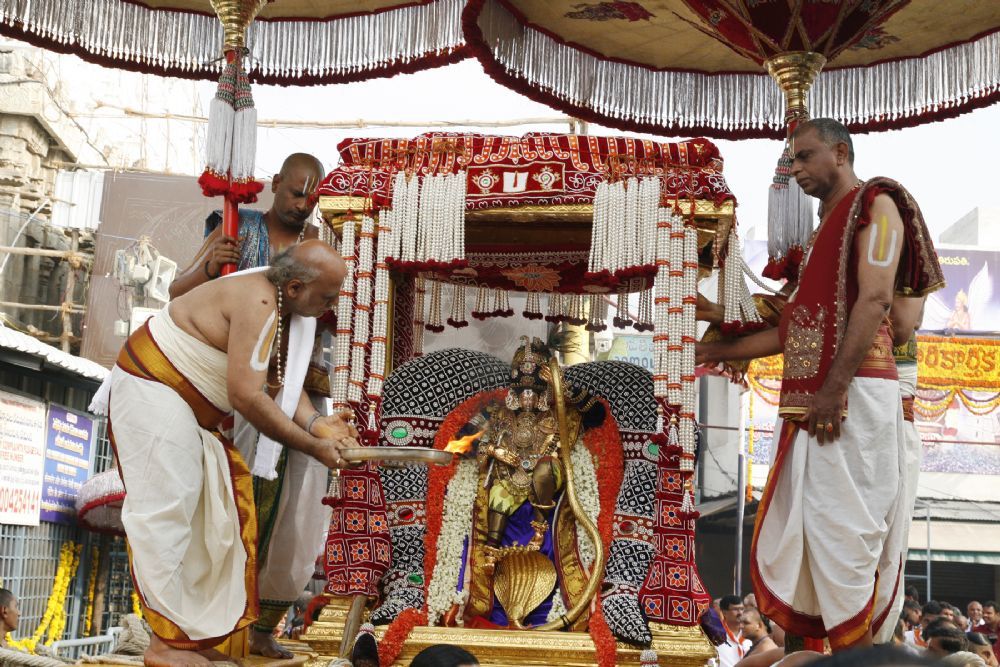 On the third day of the annual Karthika Brahmotsavams, the processional deity of goddess Padmavathi Devi, in the guise of “Kaliya Mardhani” was taken around the four-mada streets of Tiruchanur temple. On the first day the goddess has taken a celestial ride on Chinna Sesha Vahanam and on the second day goddess blessed the devotees on Pedda Sesha Vahanam.