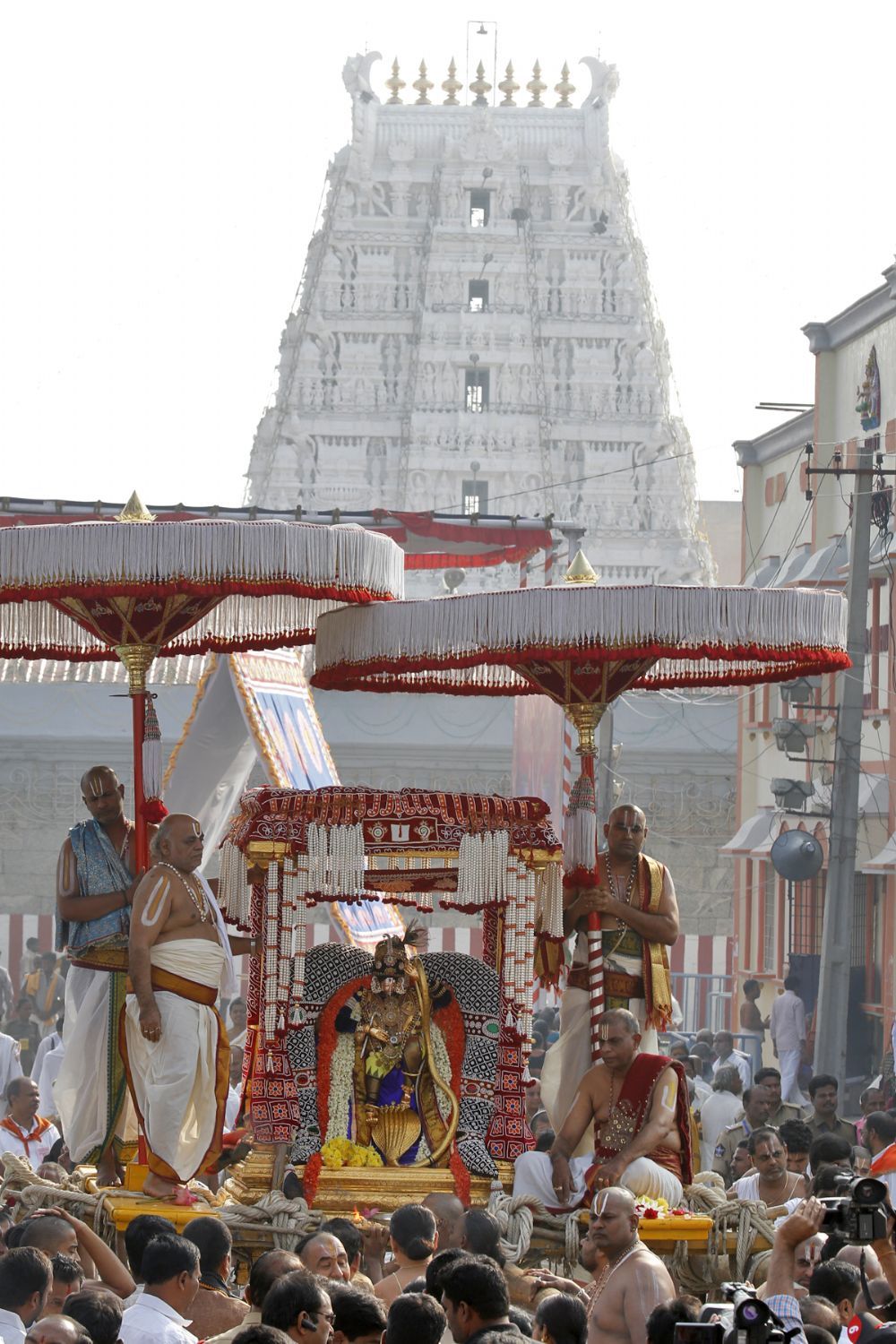 On the third day of the annual Karthika Brahmotsavams, the processional deity of goddess Padmavathi Devi, in the guise of “Kaliya Mardhani” was taken around the four-mada streets of Tiruchanur temple. On the first day the goddess has taken a celestial ride on Chinna Sesha Vahanam and on the second day goddess blessed the devotees on Pedda Sesha Vahanam.