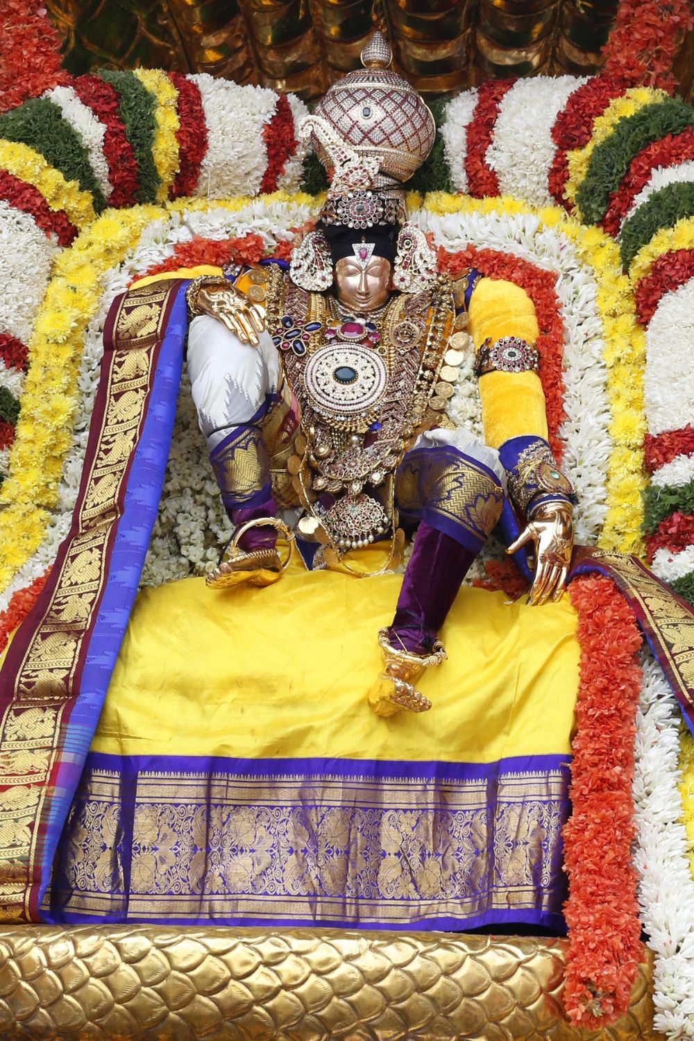 On the third day of the annual Karthika Brahmotsavams, the processional deity of goddess Padmavathi Devi, in the guise of “Kaliya Mardhani” was taken around the four-mada streets of Tiruchanur temple. On the first day the goddess has taken a celestial ride on Chinna Sesha Vahanam and on the second day goddess blessed the devotees on Pedda Sesha Vahanam.