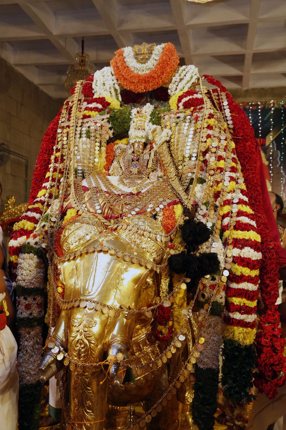 Goddess Sri Gaja Lakshmi with all charm, majesty and glory took a pride ride on the massive golden Gaja Vahanam and moved along the four mada streets with elegance blessing her devotees on the fifth day of Brahmotsavams.