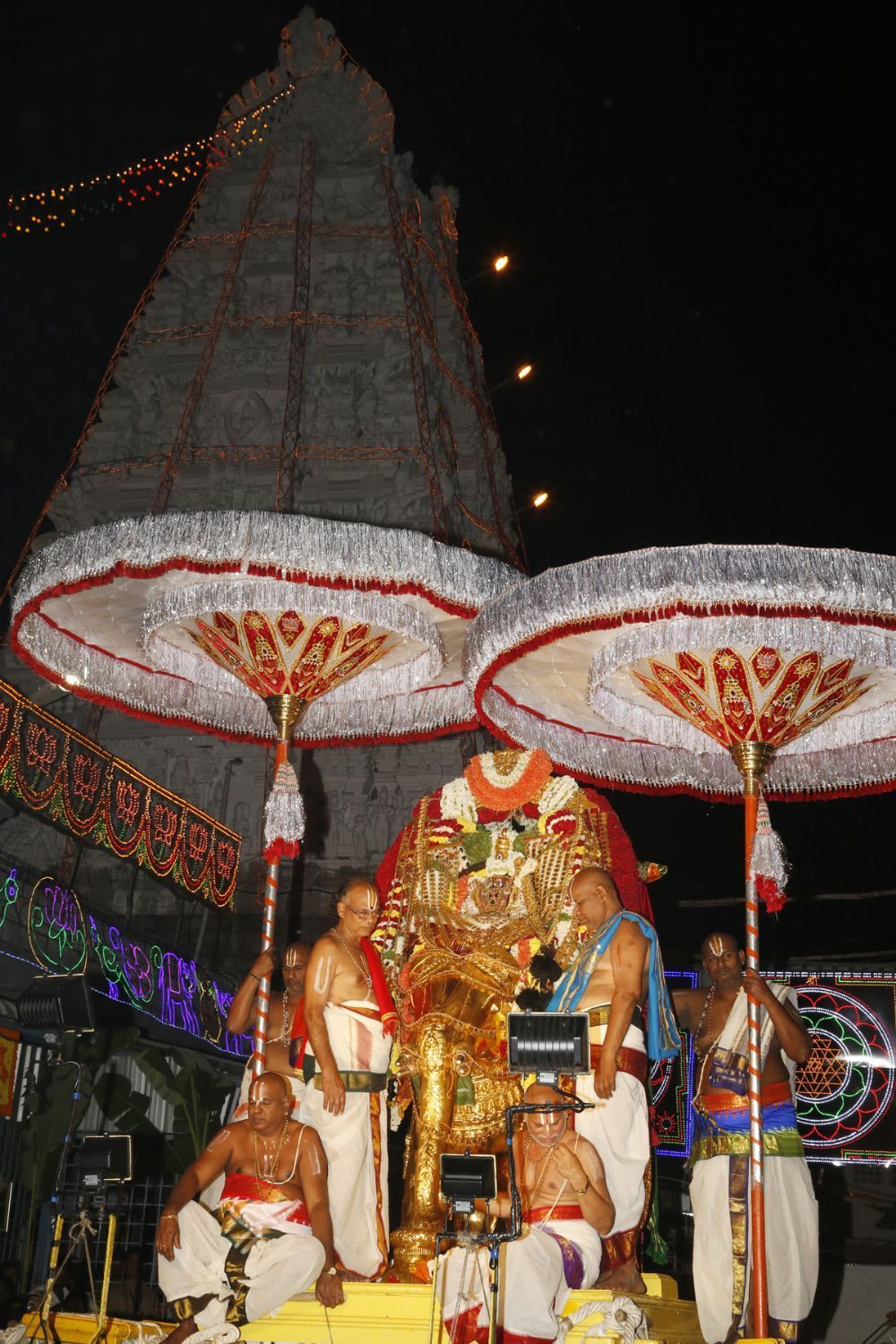 Goddess Sri Gaja Lakshmi with all charm, majesty and glory took a pride ride on the massive golden Gaja Vahanam and moved along the four mada streets with elegance blessing her devotees on the fifth day of Brahmotsavams.