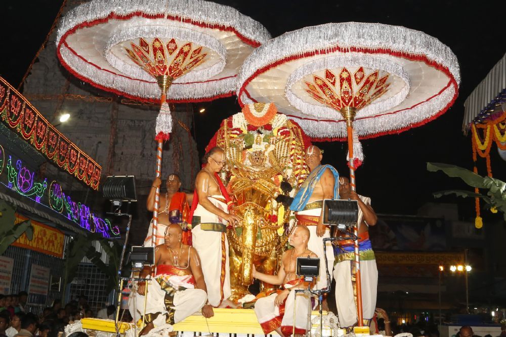 Goddess Sri Gaja Lakshmi with all charm, majesty and glory took a pride ride on the massive golden Gaja Vahanam and moved along the four mada streets with elegance blessing her devotees on the fifth day of Brahmotsavams.