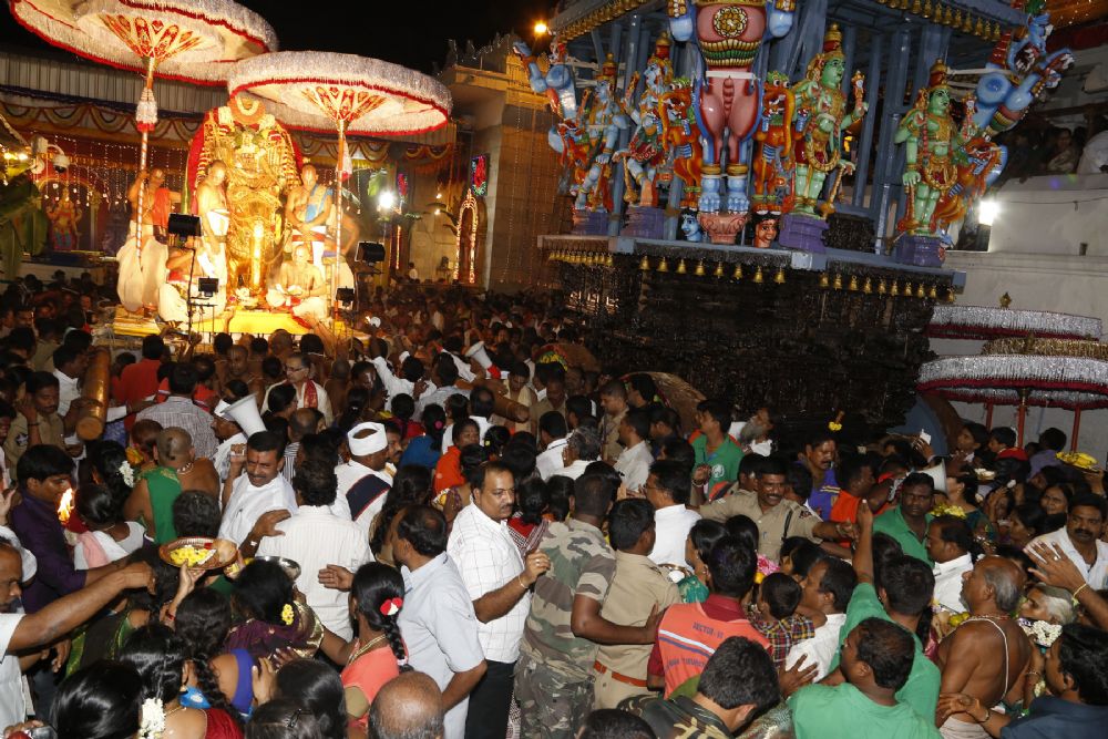 Goddess Sri Gaja Lakshmi with all charm, majesty and glory took a pride ride on the massive golden Gaja Vahanam and moved along the four mada streets with elegance blessing her devotees on the fifth day of Brahmotsavams.