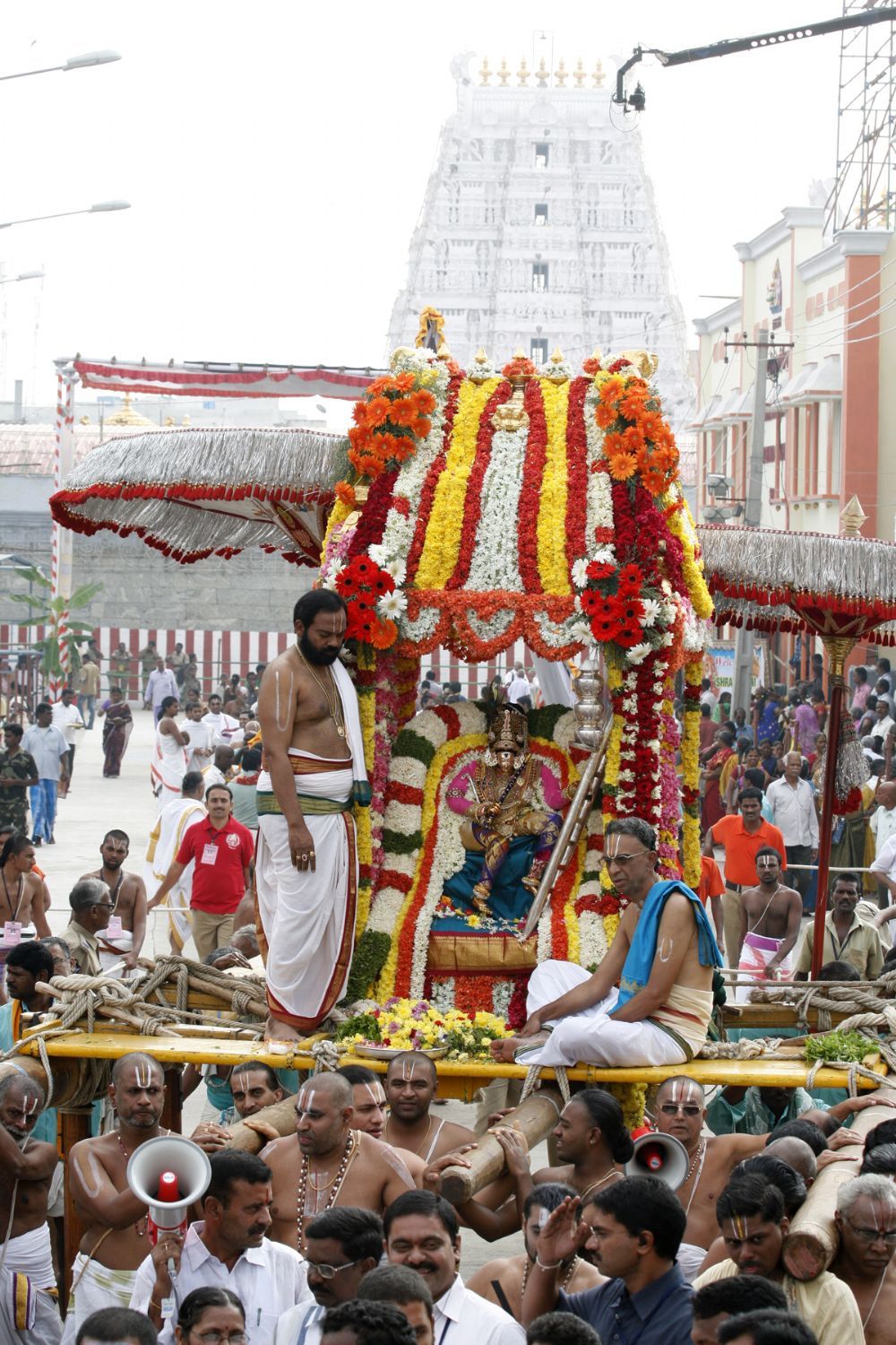 Goddess Padmavathi Devi dressed up as "Utla Krishna" went around the four-mada streets of the temple town on the ‘Sarva Bhupala Vahanam’. The attire resembled Lord Krishna, with flute in one hand and other hand trying to hit the mud pots filled with butter.