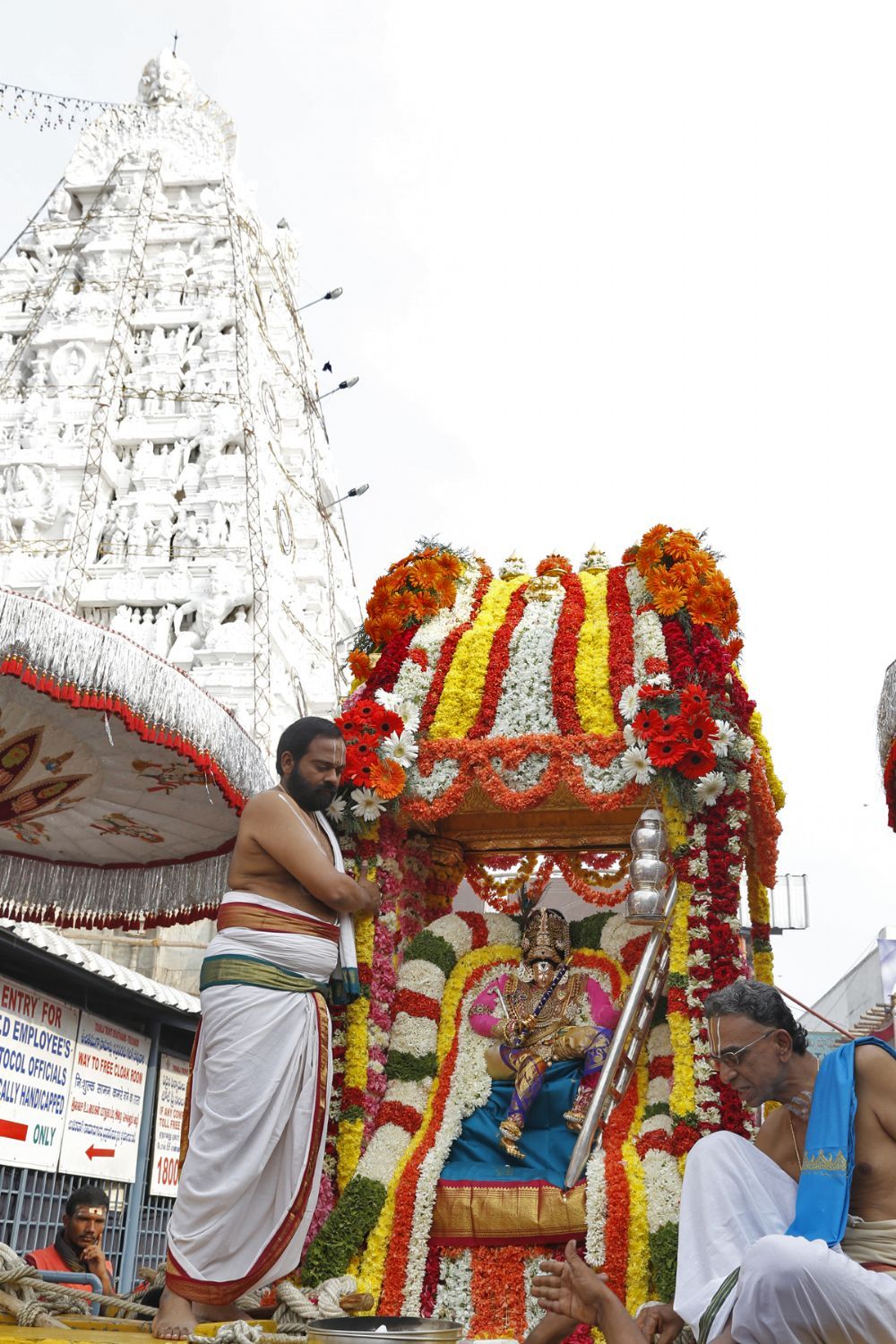 Goddess Padmavathi Devi dressed up as "Utla Krishna" went around the four-mada streets of the temple town on the ‘Sarva Bhupala Vahanam’. The attire resembled Lord Krishna, with flute in one hand and other hand trying to hit the mud pots filled with butter.