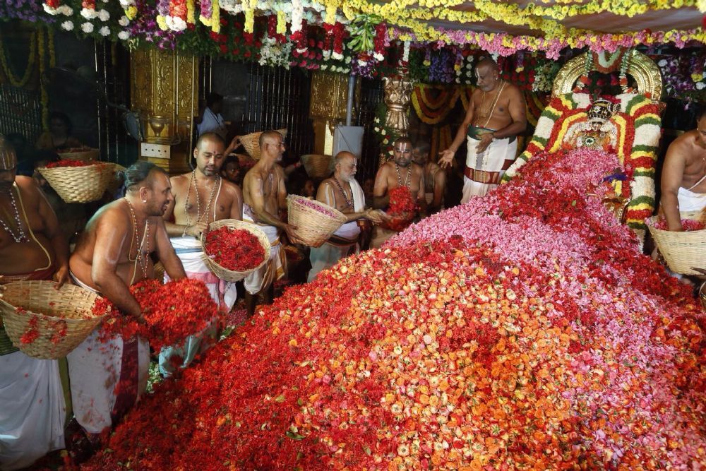 After the completion of the nine-day religious ceremony of Karthika Brahmotsavams in Tiruchanur, the Goddess Padmavathi Devi was rendered a colourful floral bath as a part of the annnual "Pushpa Yaga Mahotsavam" on Friday evening.