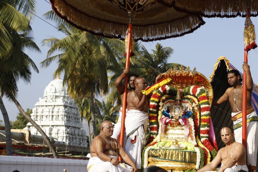 On the sunny morning of the on-going annual Brahmotsavams of Lord Kalyana Venkateswara in Tirupati the processional deity of Lord Malayappa Swamy was taken out in a grand procession on Chinna Sesha Vahanam around the mada streets encircling the holy shrine.