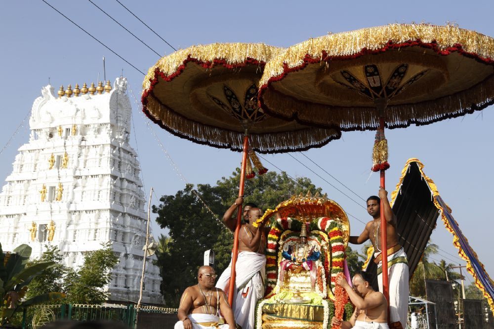 On the sunny morning of the on-going annual Brahmotsavams of Lord Kalyana Venkateswara in Tirupati the processional deity of Lord Malayappa Swamy was taken out in a grand procession on ‘Chinna Sesha Vahanam' around the mada streets encircling the holy shrine.