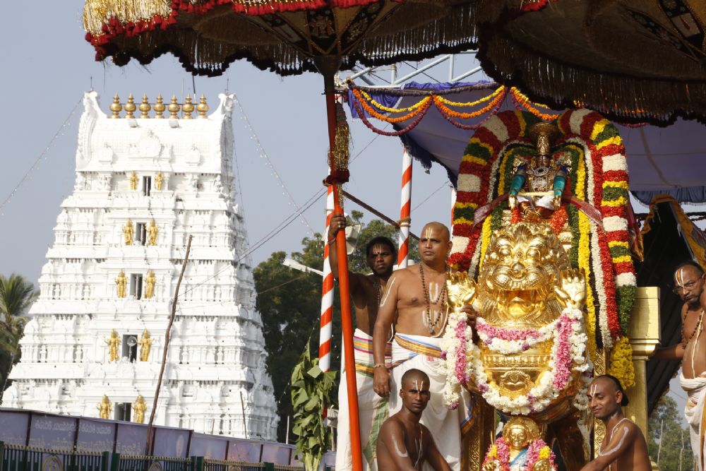 On the third day of the ongoing nine-day annual Brahmotsavam in Kalyana Venkateswara Swamy Temple at Srinivasa Mangapuram, the processional deity of Lord Kalyana Venkateswara Swamy, mounted atop the `Simha Vahanam' in form of Yoga Narasimha Swamy, was taken out in a grand procession on Thursday morning.