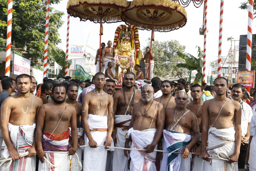 On the third day of the ongoing nine-day annual Brahmotsavam in Kalyana Venkateswara Swamy Temple at Srinivasa Mangapuram, the processional deity of Lord Kalyana Venkateswara Swamy, mounted atop the `Simha Vahanam' in form of Yoga Narasimha Swamy, was taken out in a grand procession on Thursday morning.