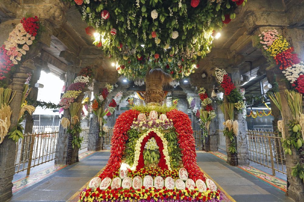 Manmadha Nama Ugadi was celebrated with religious fervour in Tirumala on Saturday. Ugadi Asthanam was performed in Bangaru Vakili of sanctum sanctorum. The floral and vegetable decorations remained a special attraction to the pilgrims.