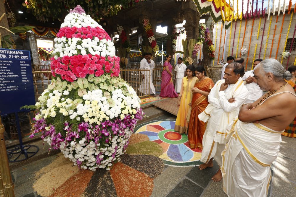 Manmadha Nama Ugadi was celebrated with religious fervour in Tirumala on Saturday. Ugadi Asthanam was performed in Bangaru Vakili of sanctum sanctorum. The floral and vegetable decorations remained a special attraction to the pilgrims.