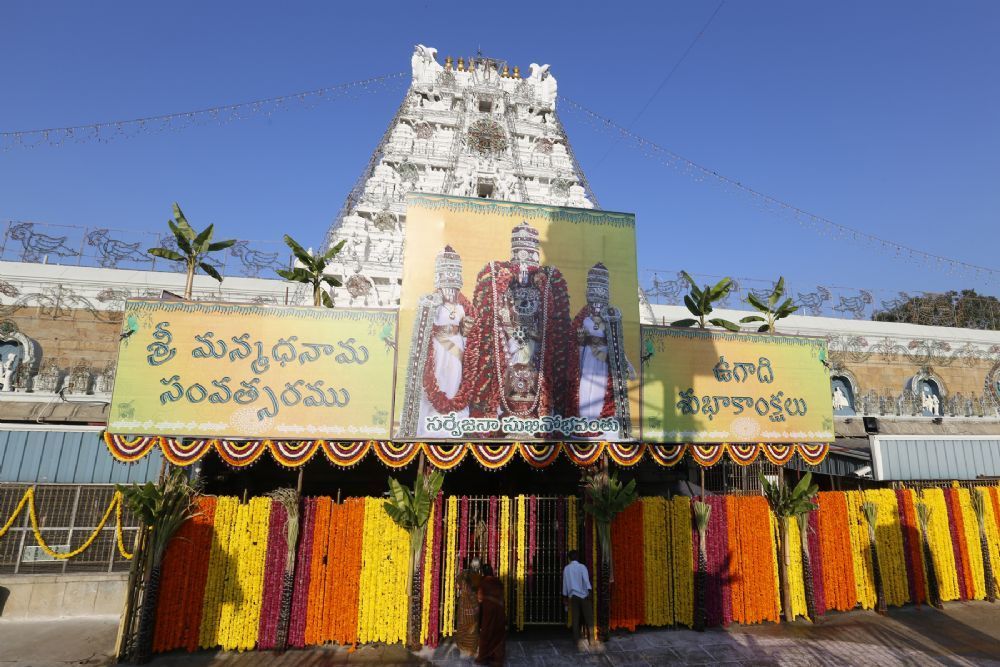 Manmadha Nama Ugadi was celebrated with religious fervour in Tirumala on Saturday. Ugadi Asthanam was performed in Bangaru Vakili of sanctum sanctorum. The floral and vegetable decorations remained a special attraction to the pilgrims.