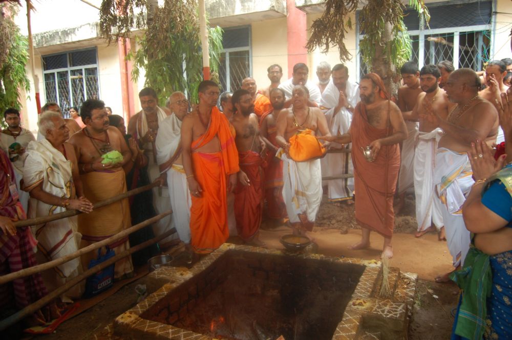 Swamy Vijayendra Saraswathi of Kanchi Kamakoti Peetam along with Vedic Preist Mathampalli Dakshina Murthy performing "Purnahuti" of Hari Hara Bramha Yagnam in Ongole on July 22nd 2015.