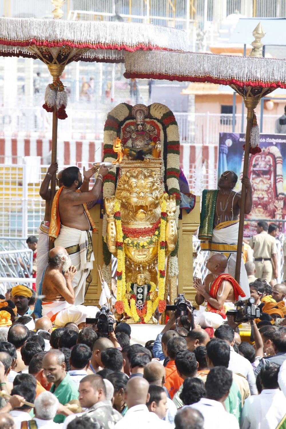 On the third day morning on Friday, the Lord is taken out in a procession on Simha Vahanam. Simha- the Lion is a symbol of royalty and power. Lord assumed the form of half man and half lion in his Narasimha Avathara.