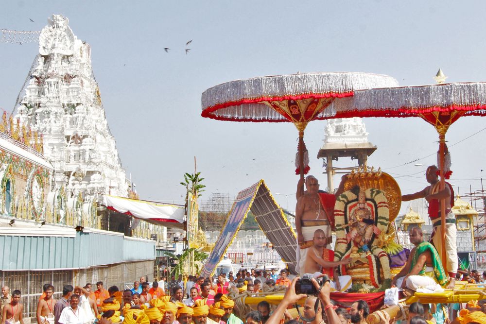 Thousands of devotees witnessed the procession of Chinna Sesha vahanam organized on the second day of the on-going nine-day annual Navaratri Brahmotsavams of Lord Venkateswara at Tirumala on Thursday morning.