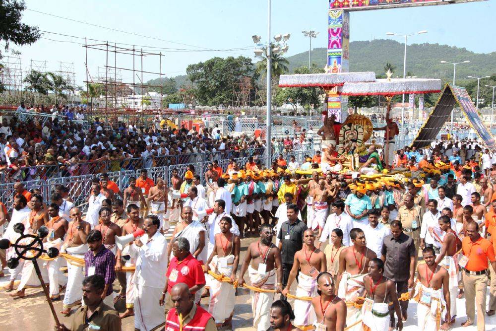 Thousands of devotees witnessed the procession of Chinna Sesha vahanam organized on the second day of the on-going nine-day annual Navaratri Brahmotsavams of Lord Venkateswara at Tirumala on Thursday morning.