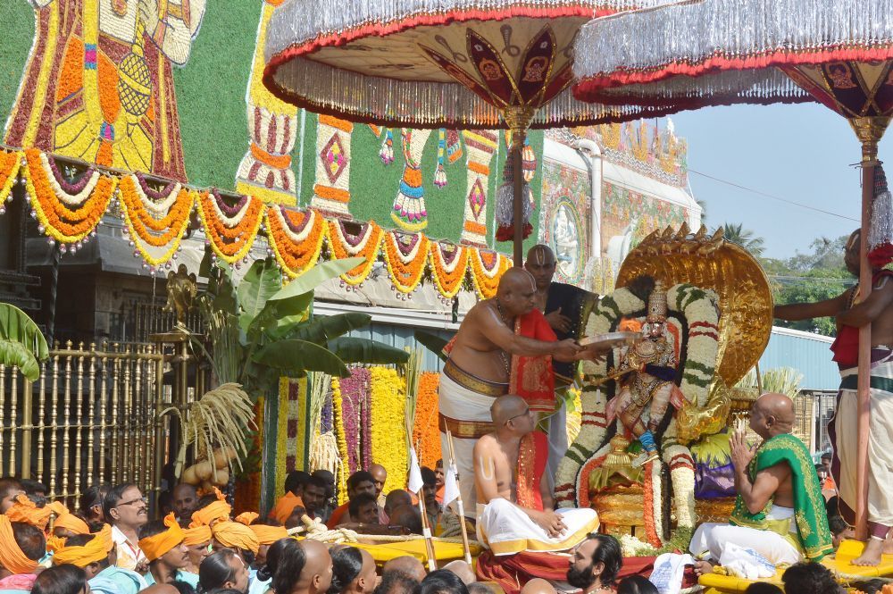 Thousands of devotees witnessed the procession of Chinna Sesha vahanam organized on the second day of the on-going nine-day annual Navaratri Brahmotsavams of Lord Venkateswara at Tirumala on Thursday morning.