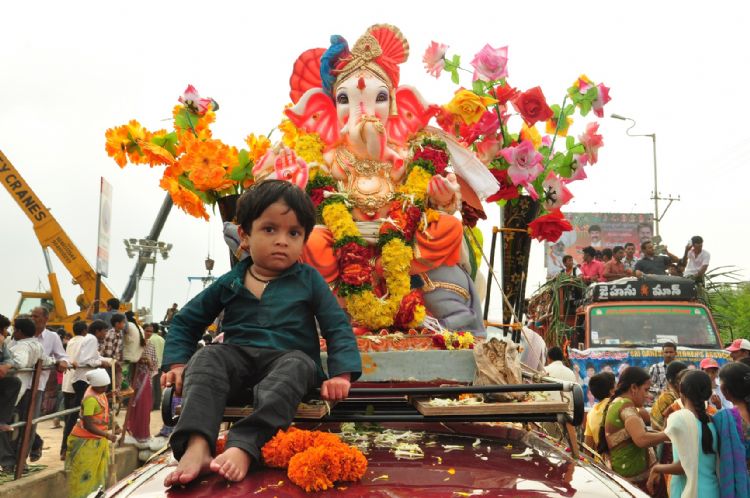 A massive Ganesh idol leading the procession of Ganesh Nimajjanam which began from Charminar to Husain Sager on Wednesday.