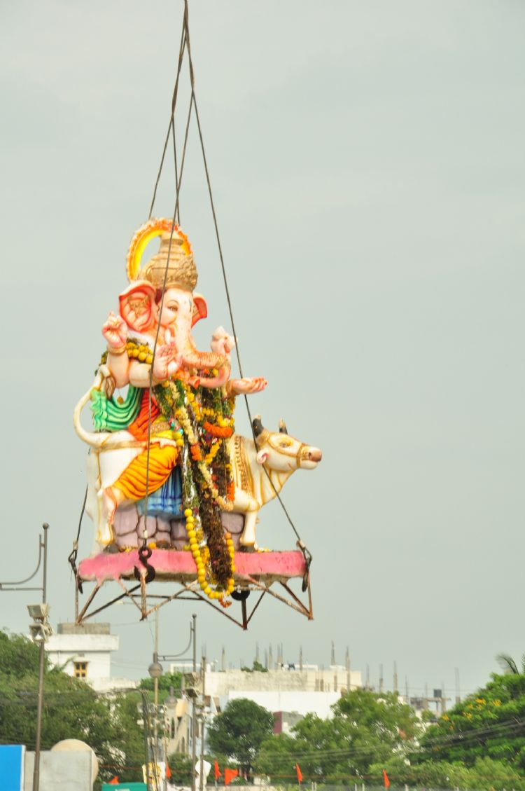 A massive Ganesh idol leading the procession of Ganesh Nimajjanam which began from Charminar to Husain Sager on Wednesday.
