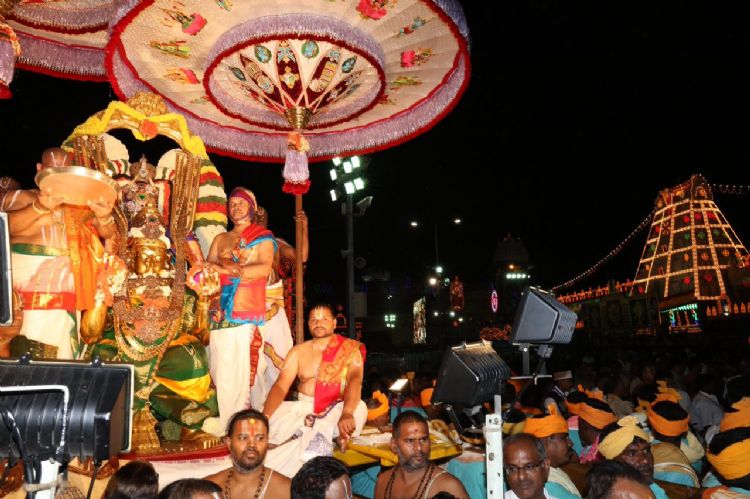 On the fifth day evening, on Friday, as a part of the ongoing Srivari Sallakatla Brahmotsavams, Lord took celestial ride on His most favourite vehicle, Garuda Vahanam, in all His splendour and majesty.