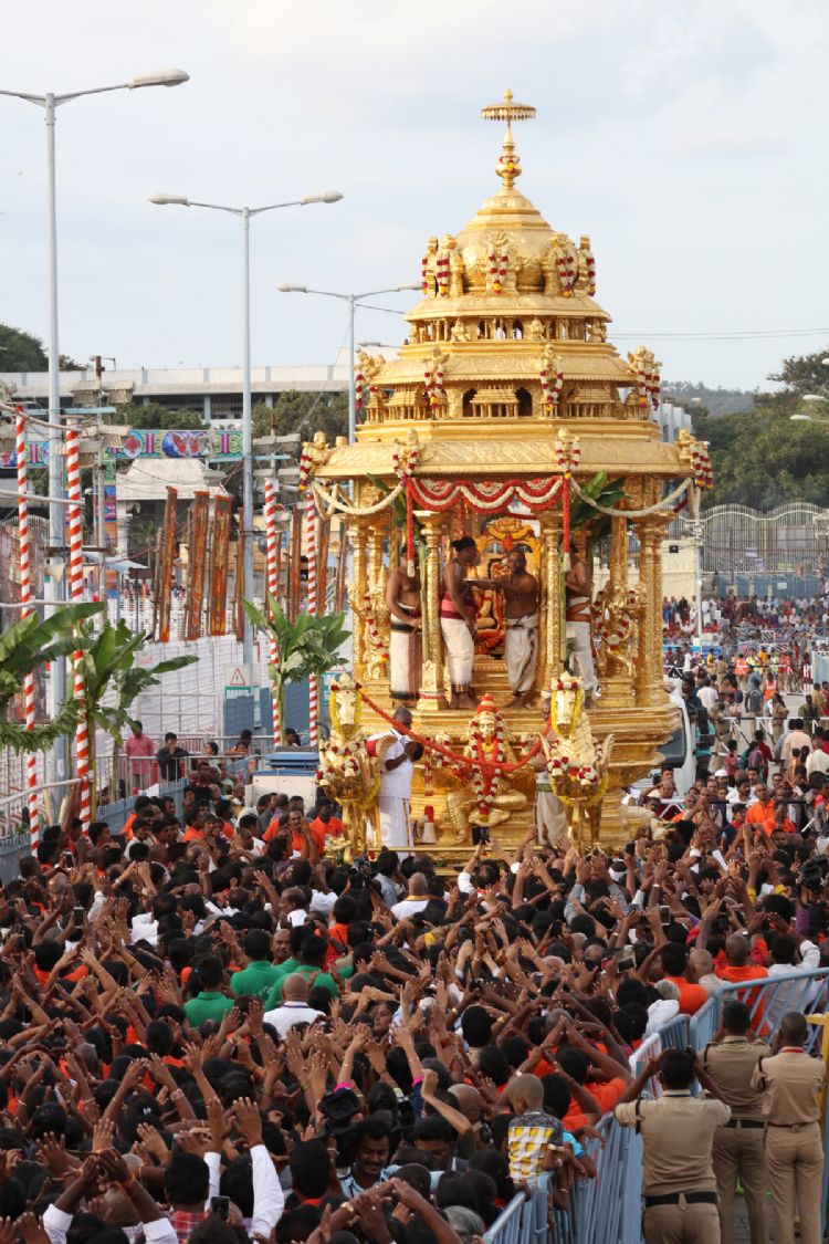 The richness, majesty and grandeur of Lord Malyappa Swamy is clearly exhibited on the glittering golden chariot procession Radharanga Dolotsavam on 8th October 2016.