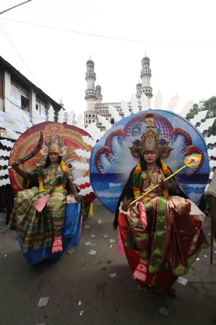 A massive Ganesh idol leading the procession of Ganesh Nimajjanam which began from Charminar to Husain Sager on Wednesday.