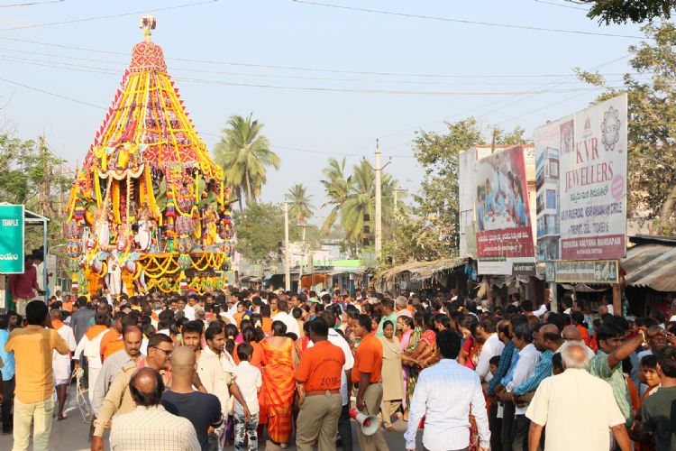 The procession of the mammoth wooden chariot Radhotsavam was observed in Srinivasa Mangapuram as a part on the ongoing annual Brahmotsavams on Sunday morning.