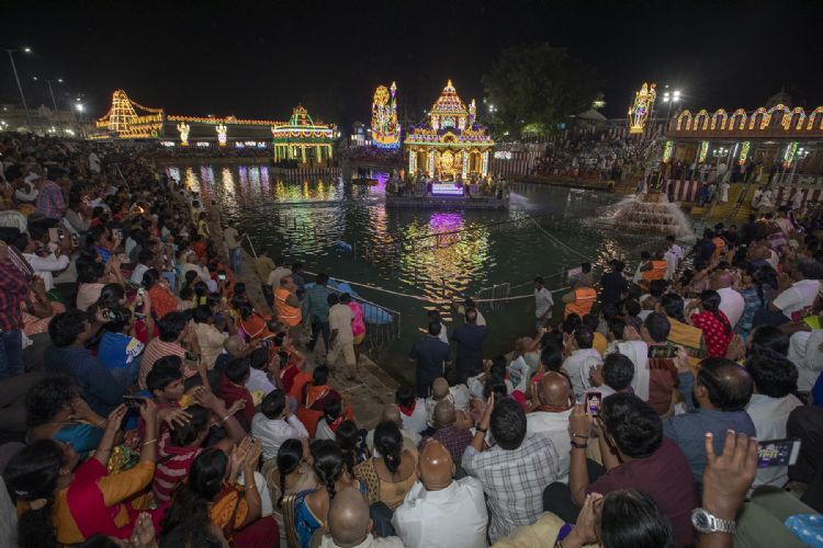 On the first day of the ongoing five day Teppotsavams in Tirumala on Sunday, Sri Ramachandra Murthy took celestial ride on finely decked float. The Lord accompanied by Sita, Lakshmana and Anjaneya took three rounds on the Teppa in Swamy Pushkarini. The entire temple tank was decorated with electrical illumination which provided feast to the eyes of pilgrims.
