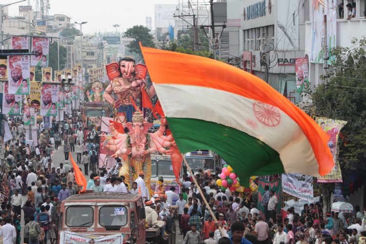 A massive Ganesh idol leading the procession of Ganesh Nimajjanam which began from Charminar to Husain Sager on Wednesday.