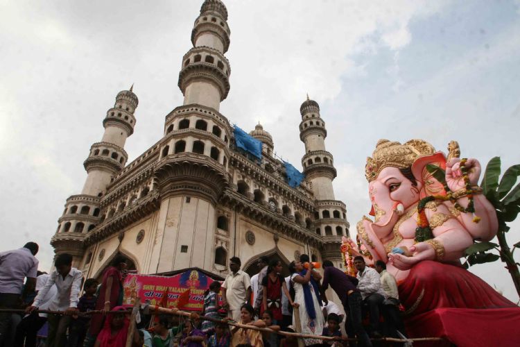 A massive Ganesh idol leading the procession of Ganesh Nimajjanam which began from Charminar to Husain Sager on Wednesday.