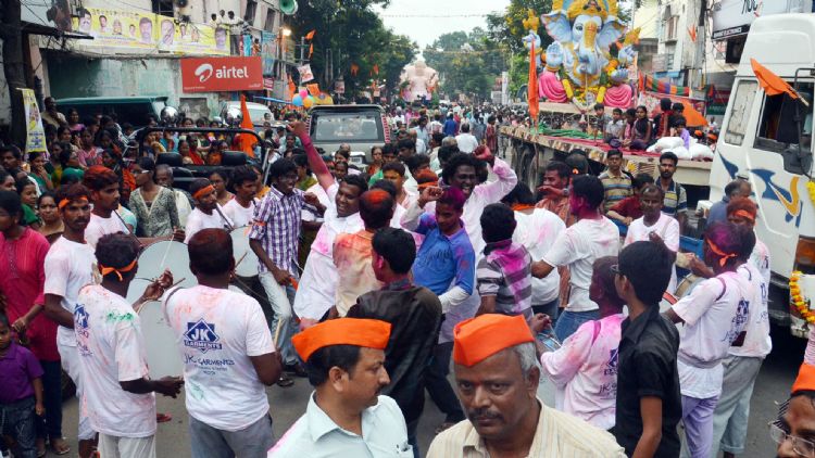 A massive Ganesh idol leading the procession of Ganesh Nimajjanam which began from Charminar to Husain Sager on Wednesday.