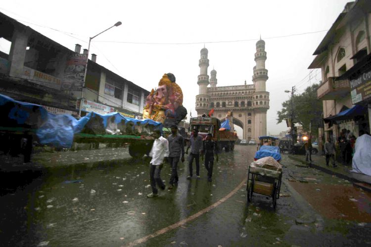 A massive Ganesh idol leading the procession of Ganesh Nimajjanam which began from Charminar to Husain Sager on Wednesday.