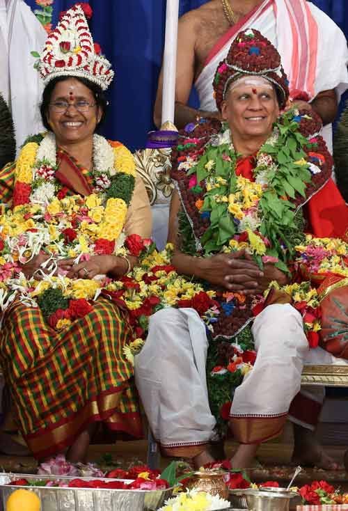 Dr. S. Mani Yegnasubramanian, Chairman of Hindu American Temple and Cultural Center (HATCC) and Sringeri Vidya Bharati Foundation (SVBF) is conferred with the title of 'Dharmatma' by the Jadadguru Shankaracharya Sri Sri Bharati Teerthananda Mahaswamiji of Sri Sharada Peetham, Sringeri, India on the auspicious Saraswathi Puja day during the recent Navarathri festivities.
