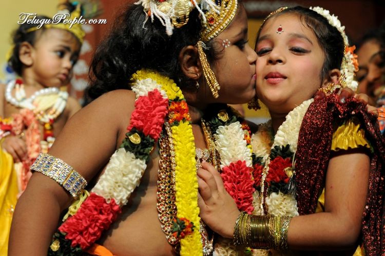 Indian Hindu devotees throughout the world celebrate Janmashtami, which marks the birth of Hindu God Lord Krishna with enormous zeal and enthusiasm. Children and adults dress as the Hindu God Krishna and his consort Radha in bright, elaborate costumes and jewelry. Human pyramids form to break the 'dahi-handi' or curd pot. The large earthenware pot is filled with milk, curds, butter, honey and fruits and is suspended from a height of 20 - 40 feet.