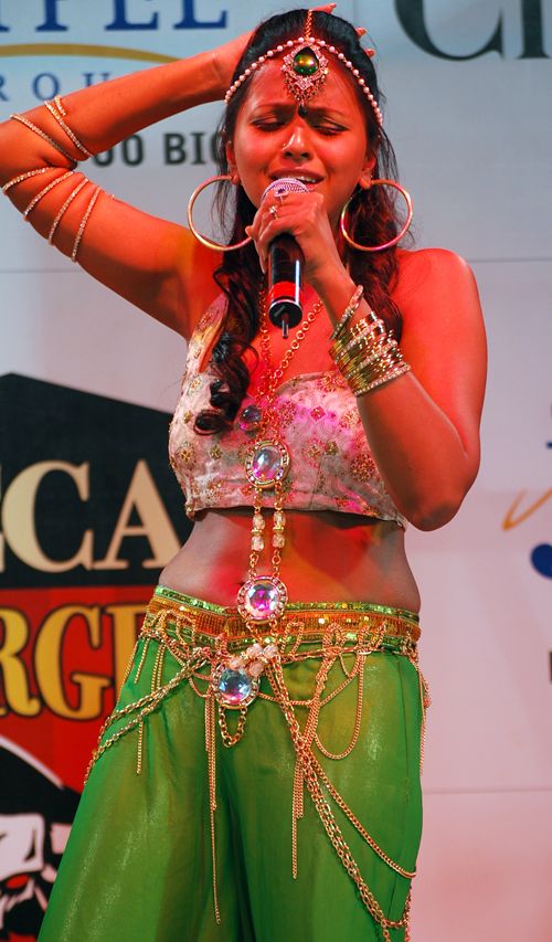 IN FULL SWING : Singer Smitha performing along with cheergirls before ther start of the IPL T20 match on Sunday.