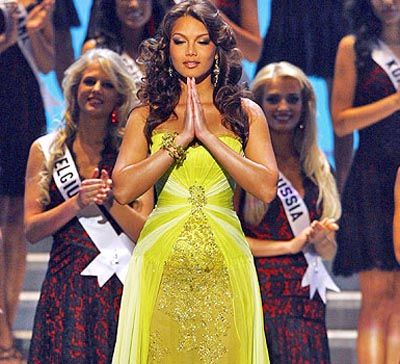 Miss Universe 2006, Zuleyka Rivera from Puerto Rico, stands in front of this year s contestants at the start of the Miss Universe 2007 pageant at the National Auditorium in Mexico City on May 28, 2007.